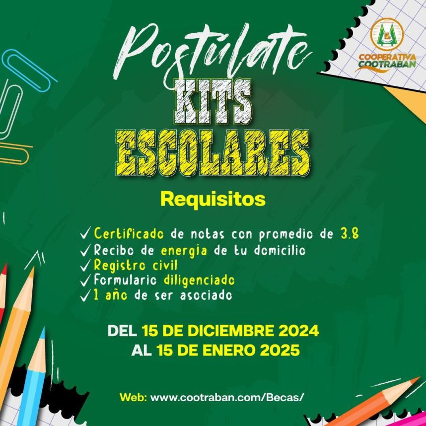 En nuestra Cooperativa podrás disfrutar de la temporada escolar donde estaremos obsequiando KITS ESCOLARES para nuestros asociados y becados en la Cooperativa Cootraban