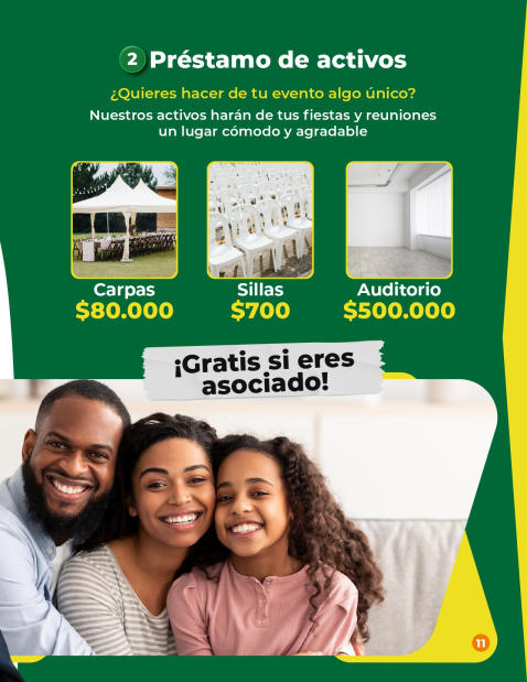 Realizamos el préstamo totalmente gratis para nuestros asociados de dumies o saltarín, silletería, carpas y auditorios:los cuales pueden utilizar en sus eventos o reuniones familiares o empresariales.